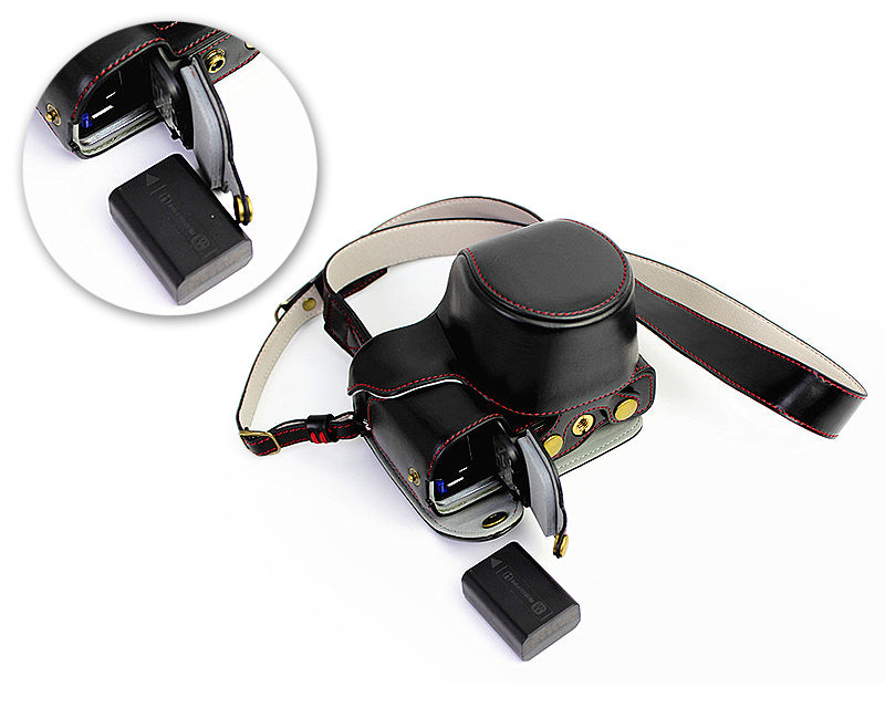 This Bottom Opening Sony Alpha a6300 Camera Leather Case is specially designed for Sony Sony Alpha a6300 and a6000 cameras with 16-50mm lens. The bottom of case can be open to replace battery or connect to computer. A tripod socket is added at the bottom of case, tripods can be used without removing the case. A camera strap included for carrying this case.