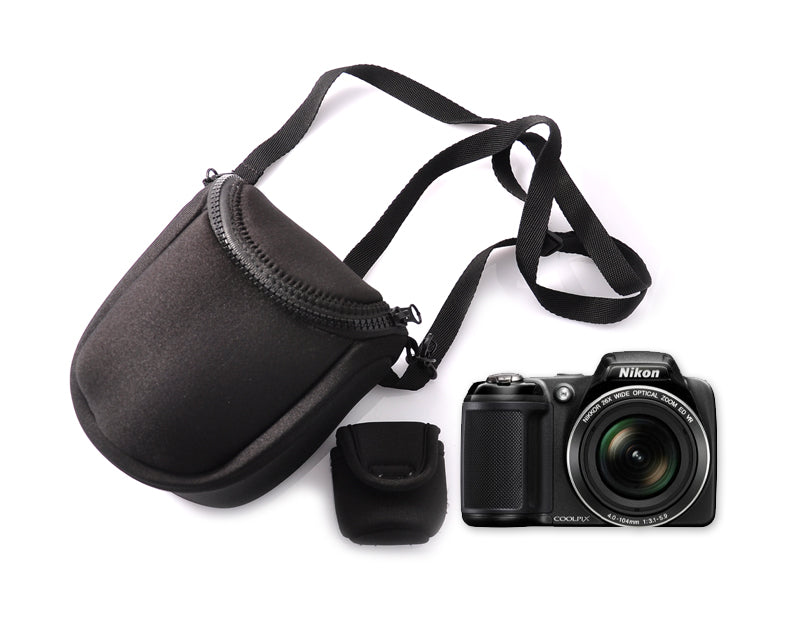 This Soft Camera Carrying Case - Black comes with a shoulder strap and a detachable battery pouch, helping you organize your camera components and accessories. This product is a carrying pouch with simple design that facilitate storage and sound protection. The zipper closure provides you with easy access.