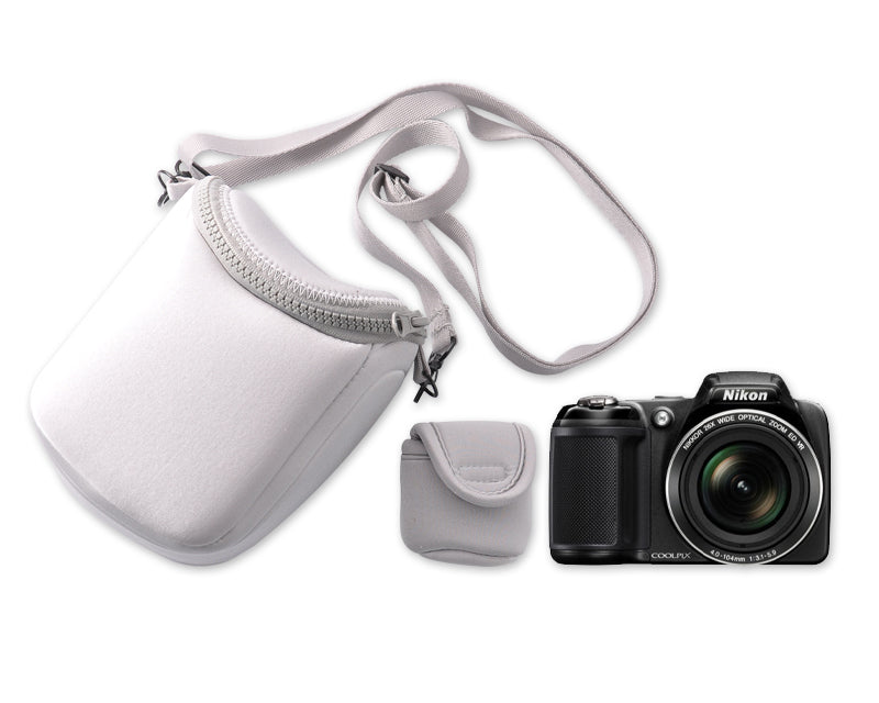 This Soft Camera Carrying Case - White comes with a shoulder strap and a detachable battery pouch, helping you organize your camera components and accessories. This product is a carrying pouch with simple design that facilitate storage and sound protection. The zipper closure provides you with easy access.