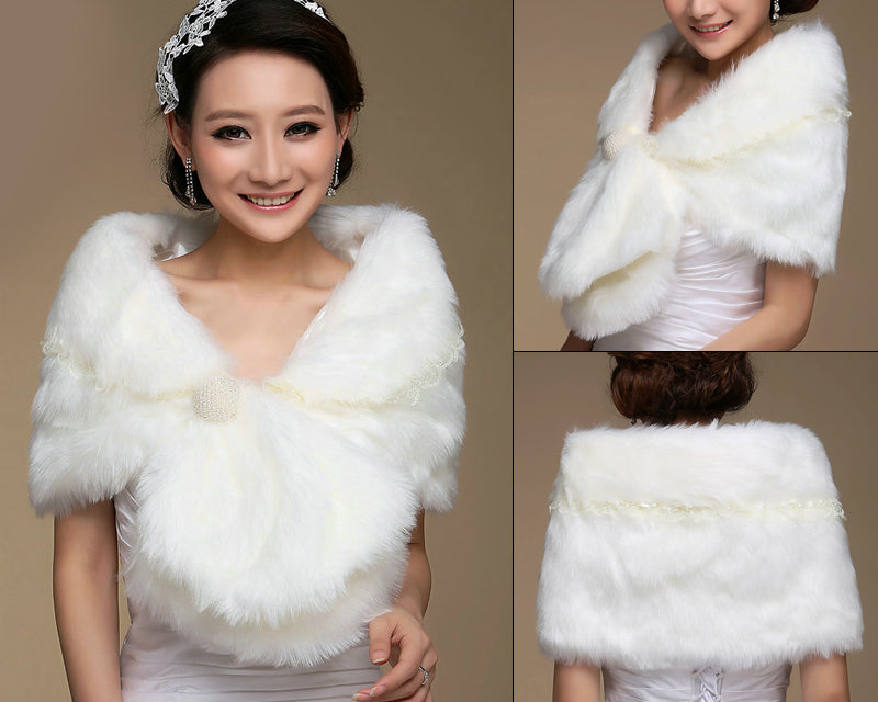This bridal shawls for wedding is made of fake fur, designed in simple but chic style, it fits most costumes. Perfect for prom dresses, bridal parties and other formal occasion, especially for outdoor event in autumn or winter.