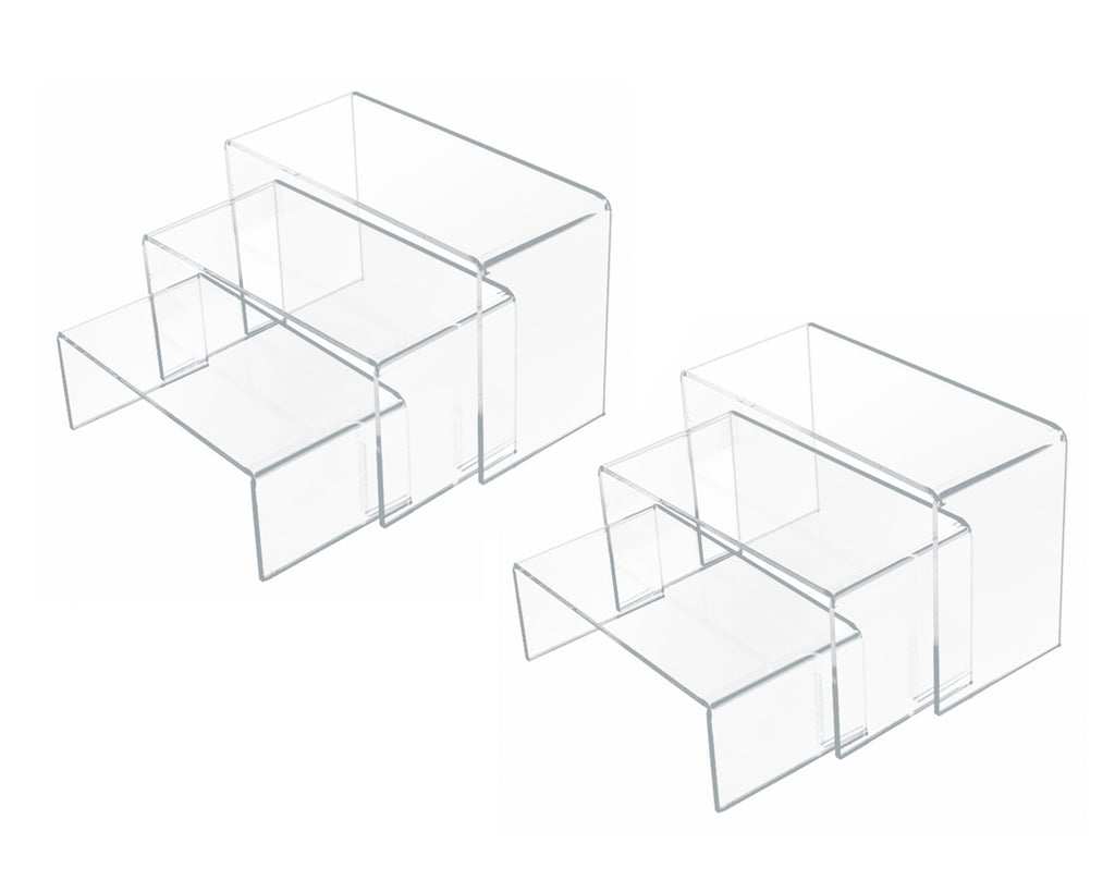 This U-Shaped Acrylic Risers 3, 4 and 5 Inches Wide Set of 6 Clear Risers for Display, for exhibiting precious collections is sold in 2 sets of 3 tiers allowing the user to create a custom layout that is ideal for a large assortment of items.