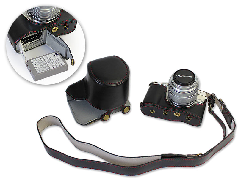 This Bottom Opening Olympus E-PL7 Camera Leather Case is specially designed for Olympus PEN E-PL7 cameras with 14-42mm lens. The bottom of case can be open to replace battery or connect to computer. A tripod socket is added at the bottom of case, tripods can be used without removing the case. A camera strap included for carrying this case.