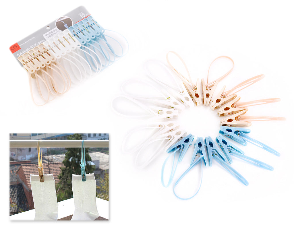 15 Pcs Non-slip Plastic Clothes Pins with Rope Straps