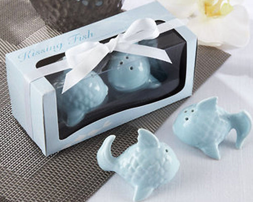 This Kissing Fish Wedding Salt And Pepper Shakers is the ideal gift for attendees at any wedding or other special occasion. It is made of ceramic. This happy couple set is delightfully presented in a ice blue, matte-finish gift box which displays the shakers behind clear, plastic window with a white-satin ribbon and a thank you card.