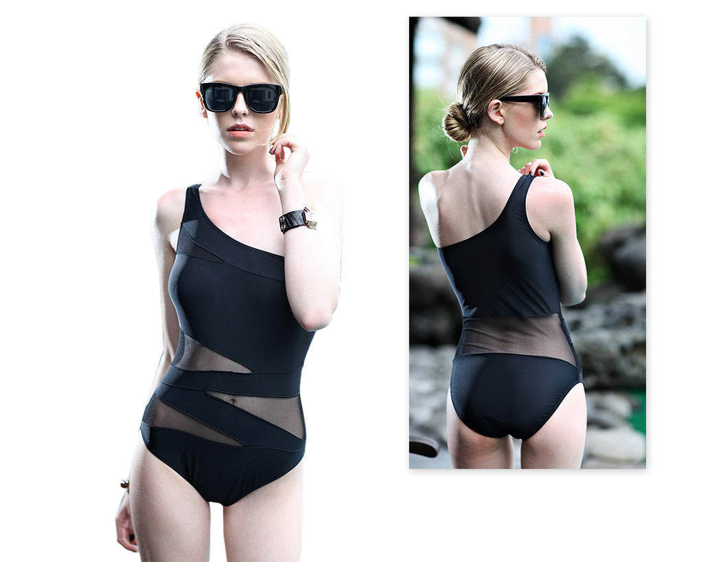 One Shoulder Mesh Splicing One Piece Swimwear - Black