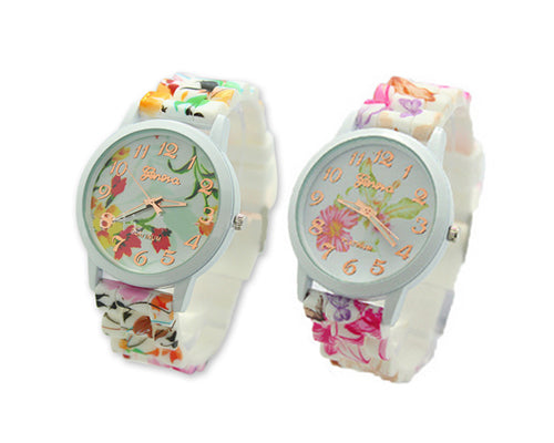 This 2 Pcs Geneva Fashion Nice Flower Silicone Analog Quartz Women Sport Wrist Watches is printed with pretty flower pattern. Featuring silicone watchband makes it more comfortable and casual. These watches for women are great apparel accessories.